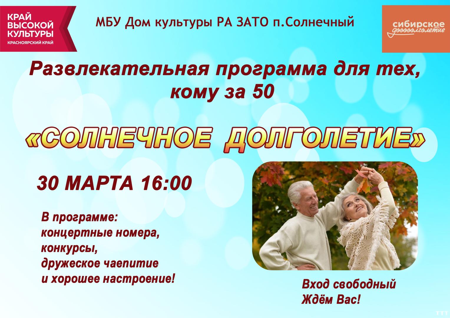 В программе «Солнечное долголетие» вас ждут: песни, танцы, конкурсы и дружеское чаепитие.