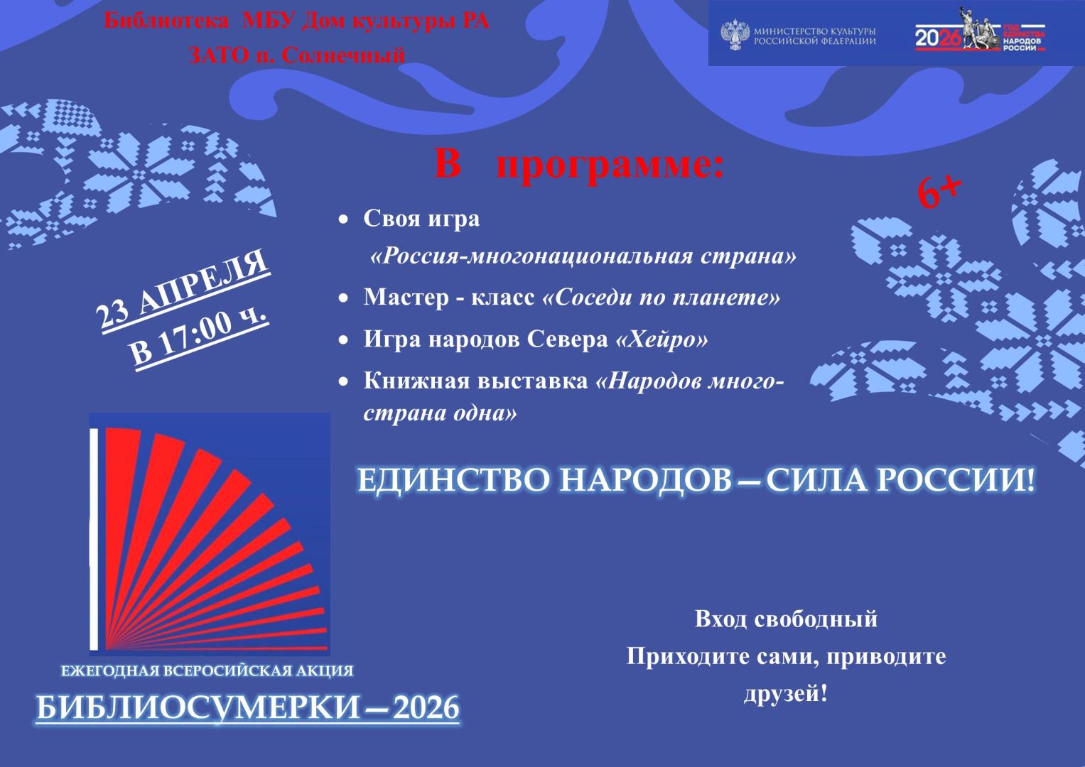 23 апреля 2026 года в 17:00 ч. Библиотека Дома культуры Российской Армии приглашает юных читателей на «Библиосумерки-2026» — специальную детскую программу. В этом году акция посвящена Году единства народов России и проходит под девизом: «Единство народов — сила России!».